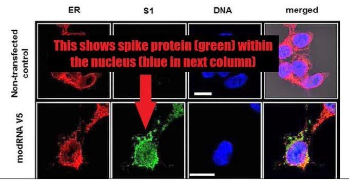 Infelizmente, o toxshot de mRNA experimental induz a produção de proteína de pico (o pico de comprimento total corresponde exatamente, aminoácido por aminoácido, ao comprimento total da proteína de pico viral5) dentro e ao redor do núcleo celular e é produzido por no mínimo 60 dias e quase por mais tempo.