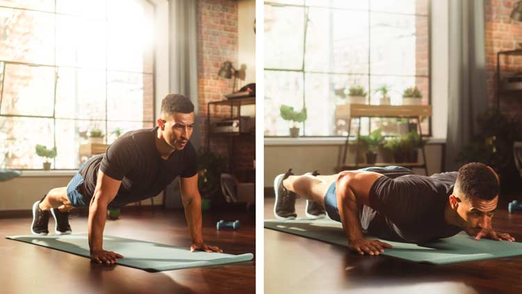 Para fazer flexões, comece na posição de prancha, com as mãos um pouco mais afastadas que a largura dos ombros e os pés juntos. Mantenha o corpo em linha reta da cabeça aos calcanhares. Abaixe o corpo dobrando os cotovelos até que seu peito quase toque o chão. Empurre de volta à posição inicial esticando os braços e mantendo o core contraído durante todo o movimento.
